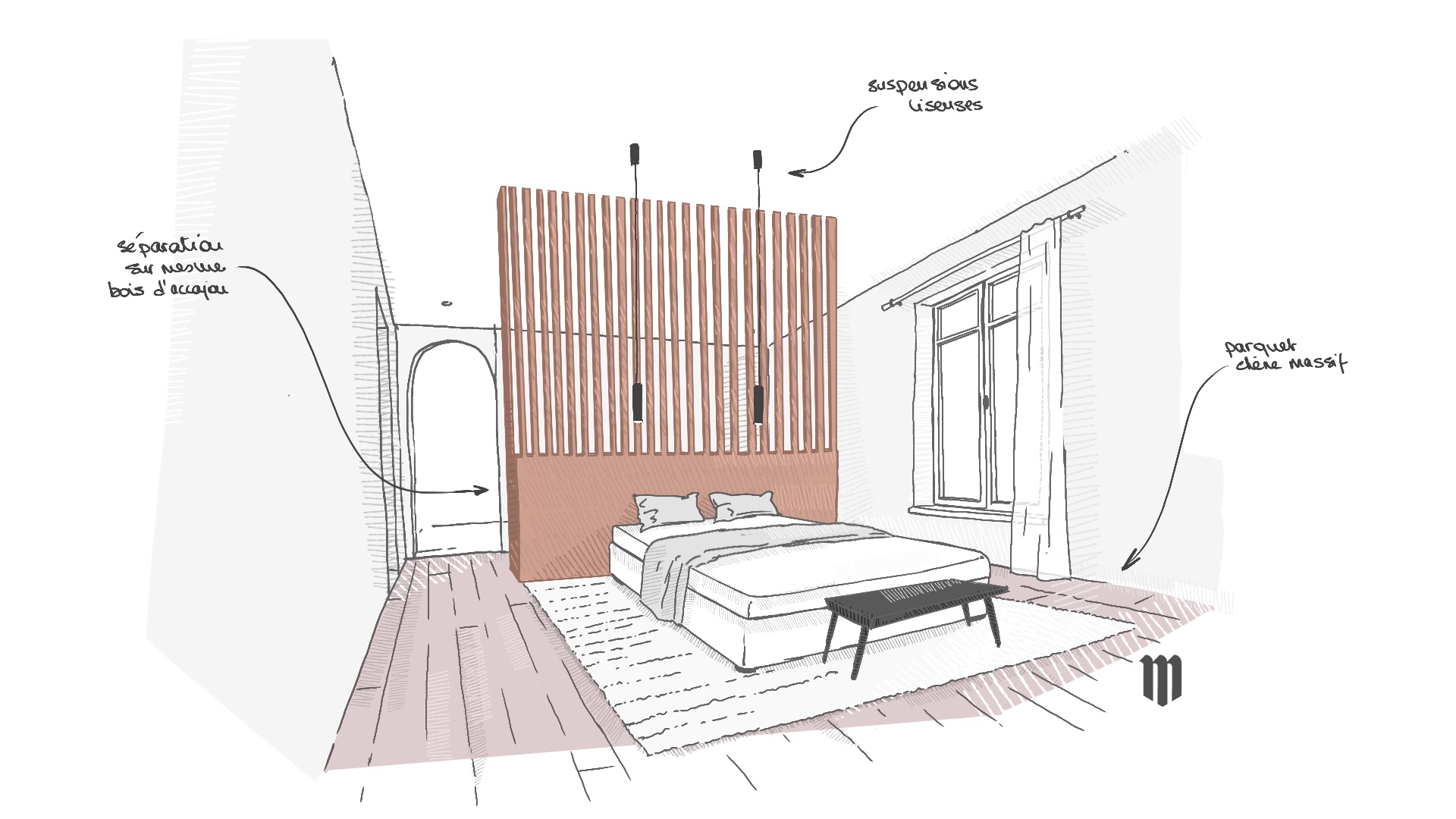 Illustration et conception, séparation et tête de lit, chambre parentale
